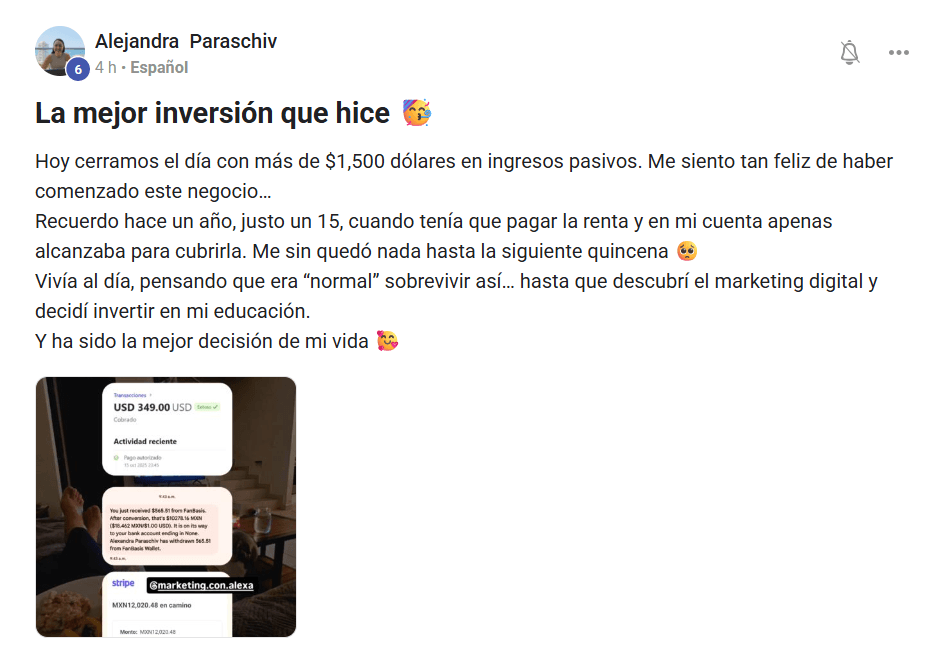 Acceso de por vida a las actualizaciones que se le hagan al curso y a una comunidad muy poderosa de gente que quiere triunfar y ayudar a otros a hacerlo. ¡SIN COBROS ADICIONALES! ¡SIN TARIFAS MENSUALES!