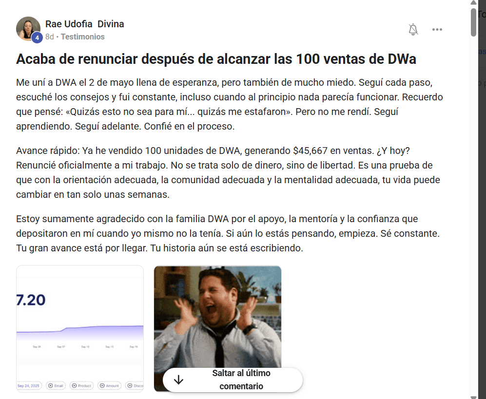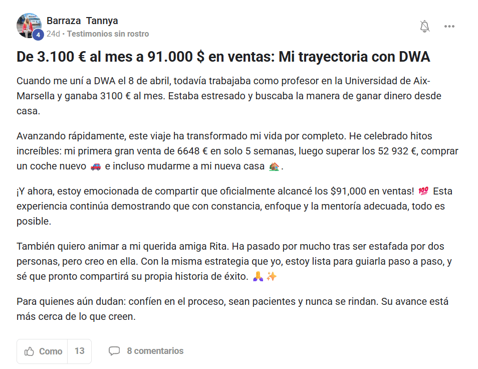 Tendrás acceso a mi chat privado en Telegram y 3 sesiones semanales de acompañamiento por Zoom, Dos mentórias que te va brindar DWA y Una mentória a la semana de mi parte.